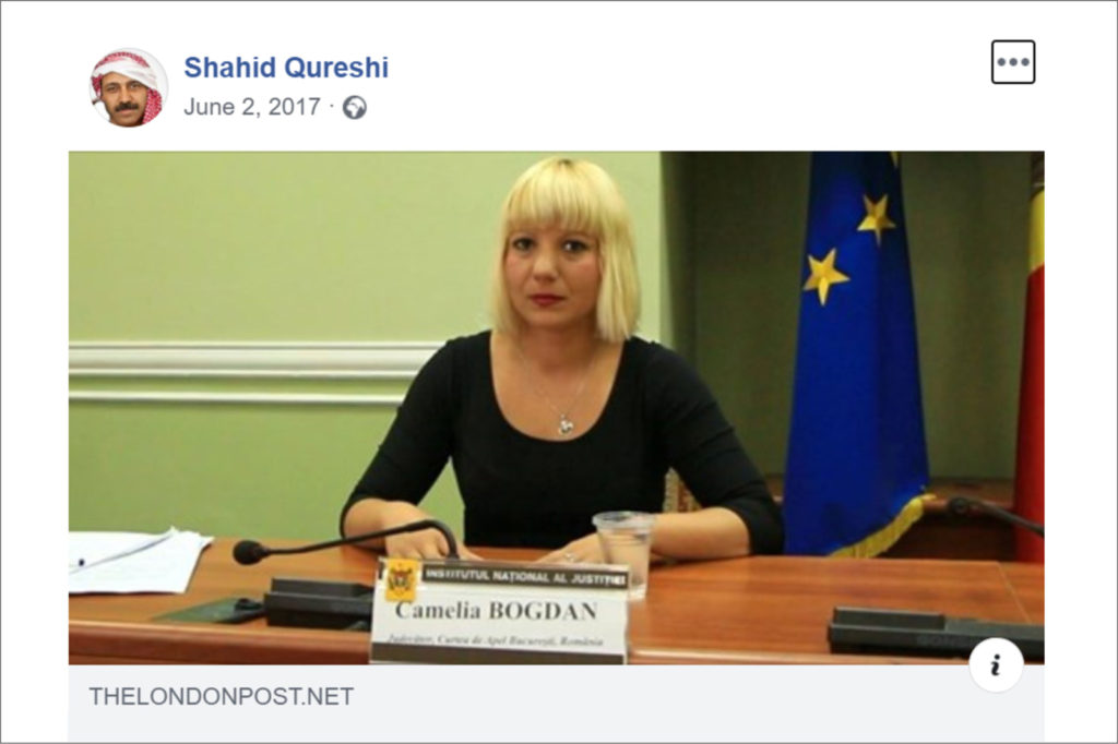 În articolul publicat în iunie 2017, și promovat de Qureshi pe pagina sa de Facebook, Camelia Bogdan se prezenta drept o victimă a sistemului judiciar din România, punând excluderea sa din magistratură pe seama faptului că magistrații din România o „pedepsesc” pentru că le este „moral superioară”. http://thelondonpost.net/romanian-judge-who-jailed-corrupt-billionaire-media-mogul-is-suspended-seeking-justice-for-herself/. Articolul a fost folosit în România pentru a susține ideea că „presa internațională” o sprijină pe Camelia Bogdan.